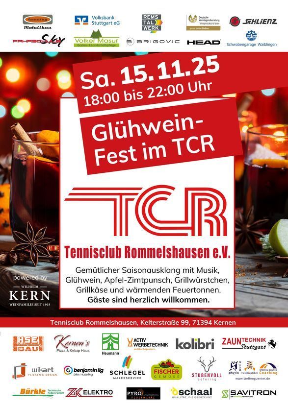 Im Angebot: Glühwein (weiß & rot) vom TCR-Sponsor Kern Weine, Punsch, Grillwürste, Grillkäse und das ein oder andere nette Pläuschchen mit 'alten' und neuen Mitgliedern & Freunden des TCR bei netter Musik.